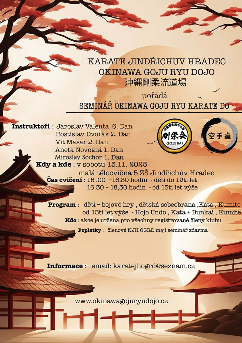 | 27. - 28.10. | Seminář s Takeji Ogawou Senseiem 9 dan Goju ryu | Č. Budějovice |